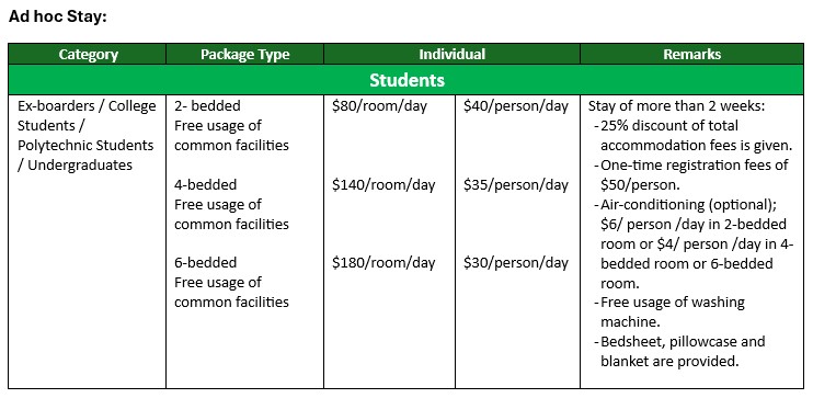 - A non-refundable registration fee of $50 for Uni/Poly student and $200 for Secondary student and a deposit of $400 are required for new applicant. The deposit will be refunded when the boarder leaves the hostel.